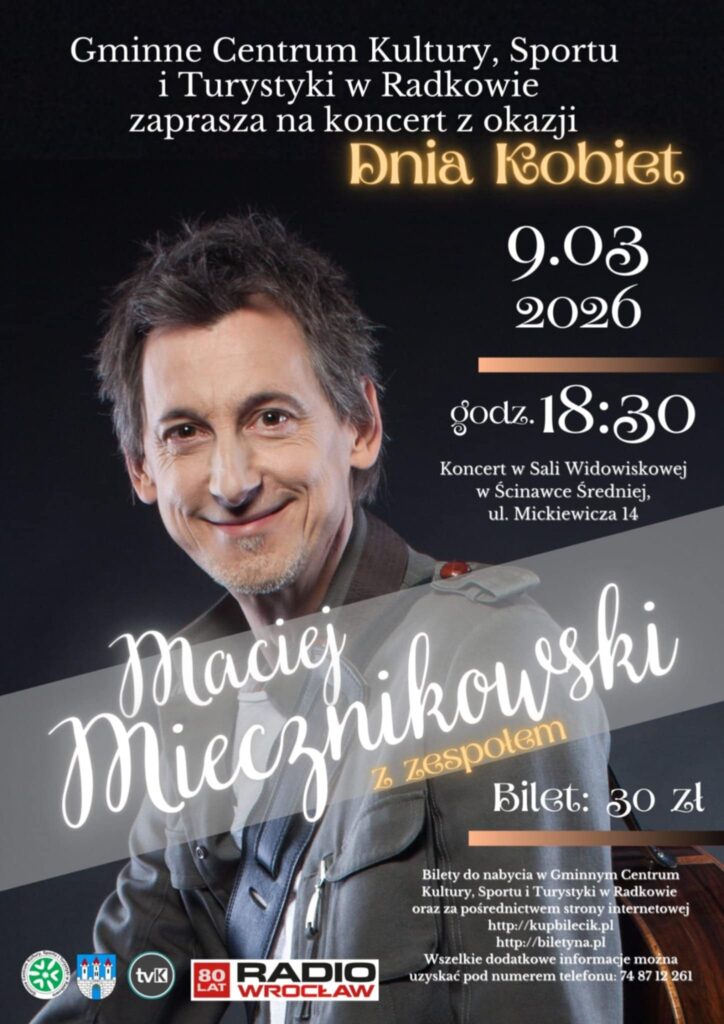 Jak co roku Gminne Centrum Kultury, Sportu i Turystyki w Radkowie nie zapomina o święcie pań. W tym roku na Dzień Kobiet przyjedzie do Radkowa na koncert Maciej Miecznikowski z zespołem. Koncert odbędzie się 9 marca o godz. 18:30 w Sali Widowiskowej w Ścinawce Śr. Bilety kosztują 30 zł.
