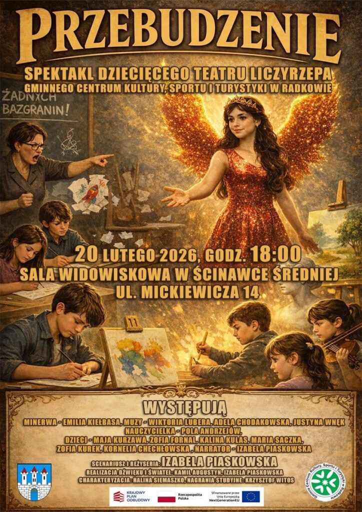 To wyjątkowe widowisko teatralne przygotowali młodzi artyści z Dziecięcego Teatru Liczyrzepa. To amatorska grupa teatralna działająca przy Gminnym Centrum Kultury i Turystyki w Radkowie. Mali artyści tworzą spektakle takie jak „Bajkolandia” czy „Przebudzenie”, które wystawiane są lokalnie np. podczas wydarzeń kulturalnych w regionie Gór Stołowych. Spektakl, który zobaczymy już 20 lutego o godz. 18:00 w Sali Widowiskowej w Ścinawce Śr. to efekt wielu tygodni pracy, prób i ogromnego zaangażowania dzieci oraz instruktorów.
