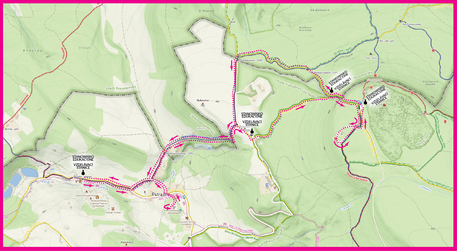 Szlak Daniela Duchača powstał w ramach polsko-czeskiego projektu. Trasa zaczyna się i kończy przy Muzeum Kultury Pogórza Sudeckiego w Pstrążnej. Prowadzi przez Pstrążną, czeskie Końciny, Bukowinę Kłodzką oraz okolice Błędnych Skał. Po drodze znajdują się liczne tablice edukacyjne. Kody QR umożliwiają wysłuchanie legend oraz pieśni. Powstanie nowej, transgranicznej ścieżki edukacyjnej poświęcone zostało Danielowi Duczowi, pierwszemu przewodnikowi i propagatorowi Błędnych Skał, który oprowadzał po labiryncie skalnym turystów i kuracjuszy wędrujących z Kudowy i Machova. Dzięki temu odwiedzający Góry Stołowe poznają historię, kulturę i obyczaje regionu, ze szczególnym uwzględnieniem historii tzw. Czeskiego Kątka. Nie zabraknie też informacji o ochronie przyrody. Z kolei przejście szlakiem na czeską stronę stanowi o wyjątkowości i oryginalności ścieżki. Ponad siedmiokilometrowy szlak prowadzi nas po urokliwych zakątkach w polskiej i czeskiej części Gór Stołowych.