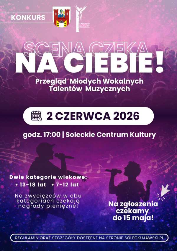 Po ogromnym zainteresowaniu, jakie wzbudziła zeszłoroczna rywalizacja uzdolnionych mieszkańców, Solec Kujawski ponownie otwiera swoją scenę dla młodych wokalistów. To idealna okazja, by pokazać światu (a przynajmniej regionowi!) swój głos, stanąć na profesjonalnej scenie i powalczyć o wysokie nagrody pieniężne.